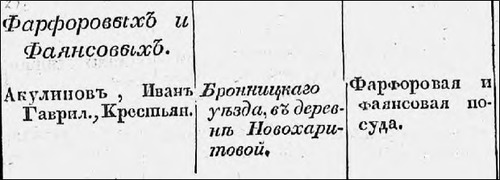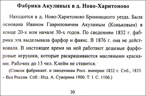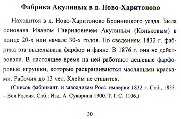 Например, в книге А.В. Селиванова «Фарфор и фаянс Российской империи» о фабрике Акулиных написано следующее: